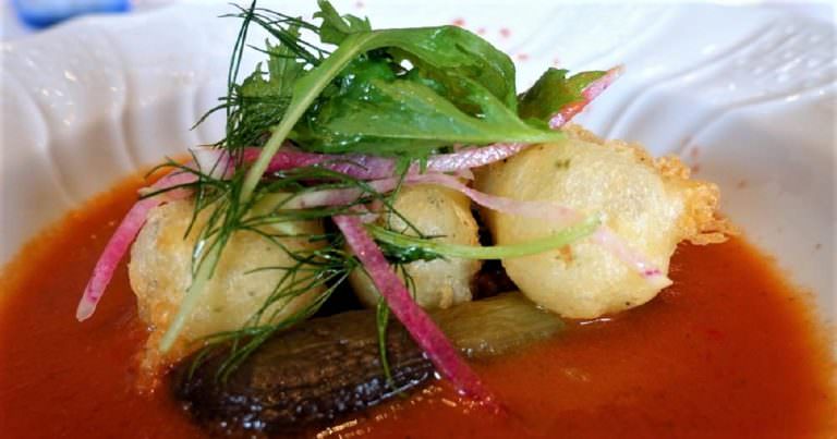 先用精緻小品墊墊胃之後,前菜就開始展現神技~超好吃的普羅旺斯風味炸魚燉茄子蔬菜