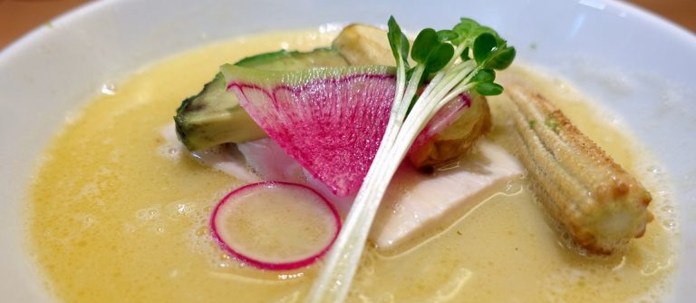 當家名物雞白湯拉麵,這個topping令人驚喜,顏色粉嫩、添加健康的酪梨、茗荷、炙烤玉米筍等蔬菜,擺盤起來非常精緻,內容物也跟大部分的拉麵大不同