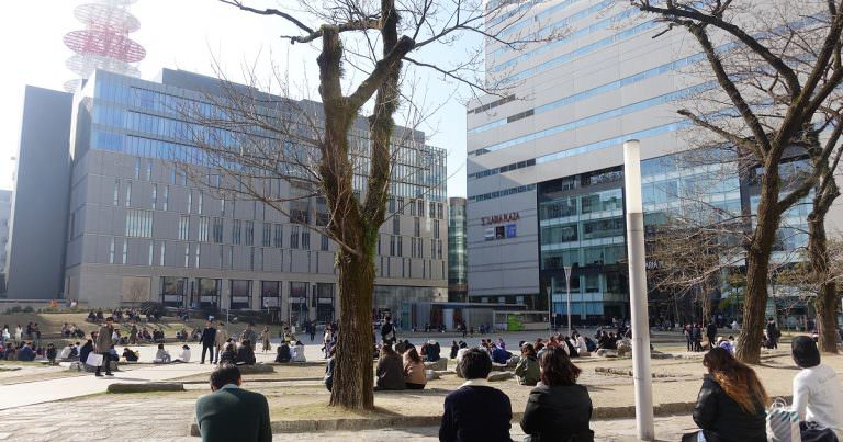 了解了天神地下街及他左右鄰居百貨的夥伴後,到地面上來看看這些百貨的相對位置,從西鐵福岡站中央口出來,就是充滿綠意的廣場和警固神社,假日許多人都在此放風~好不愜意